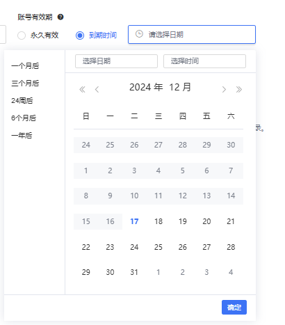 | 账号有效期 | 非必填,若未选择,则默认是永久有效,可选择账号到期时间,在到期时间之后,该账号将被设置为禁用状态,被禁用的账号在登录后将进行拦截,需重新设置有效期,其账号状态才变成启用。若是被手动禁用的账号,在账号有效期过期后,除重新设置有效期外,还需手动进行账号启用。 | |