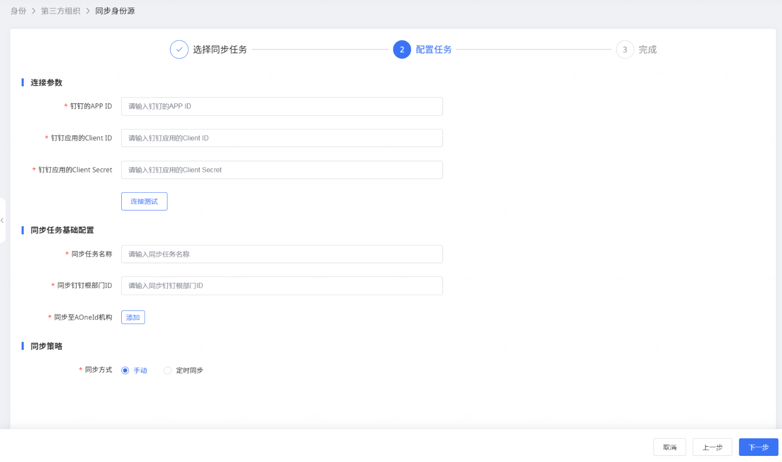 | 同步方式 | 必填,可选择“手动”或者“定时同步”。