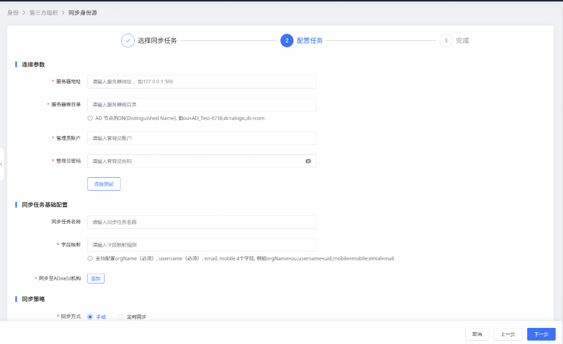 | 同步至AOneId机构 | 必填,选择要同步到的AOneId机构。 |