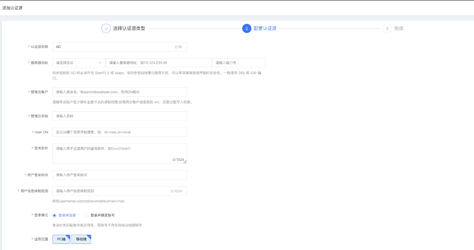 选择AD 认证源类型。输入配置参数,完成AD认证源配置。