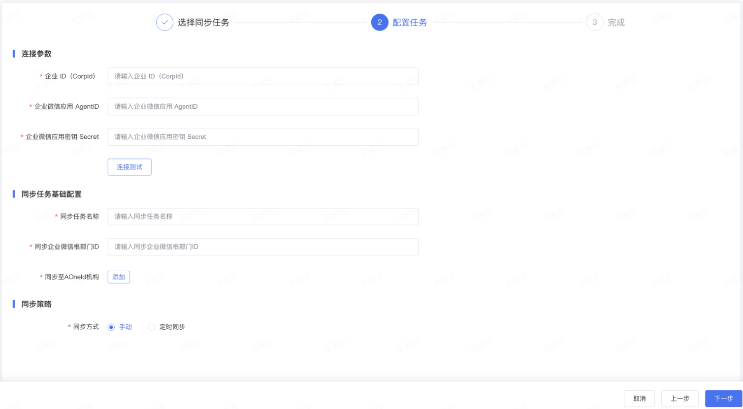 | 同步方式 | 必填,可选择“手动”或者“定时同步”。