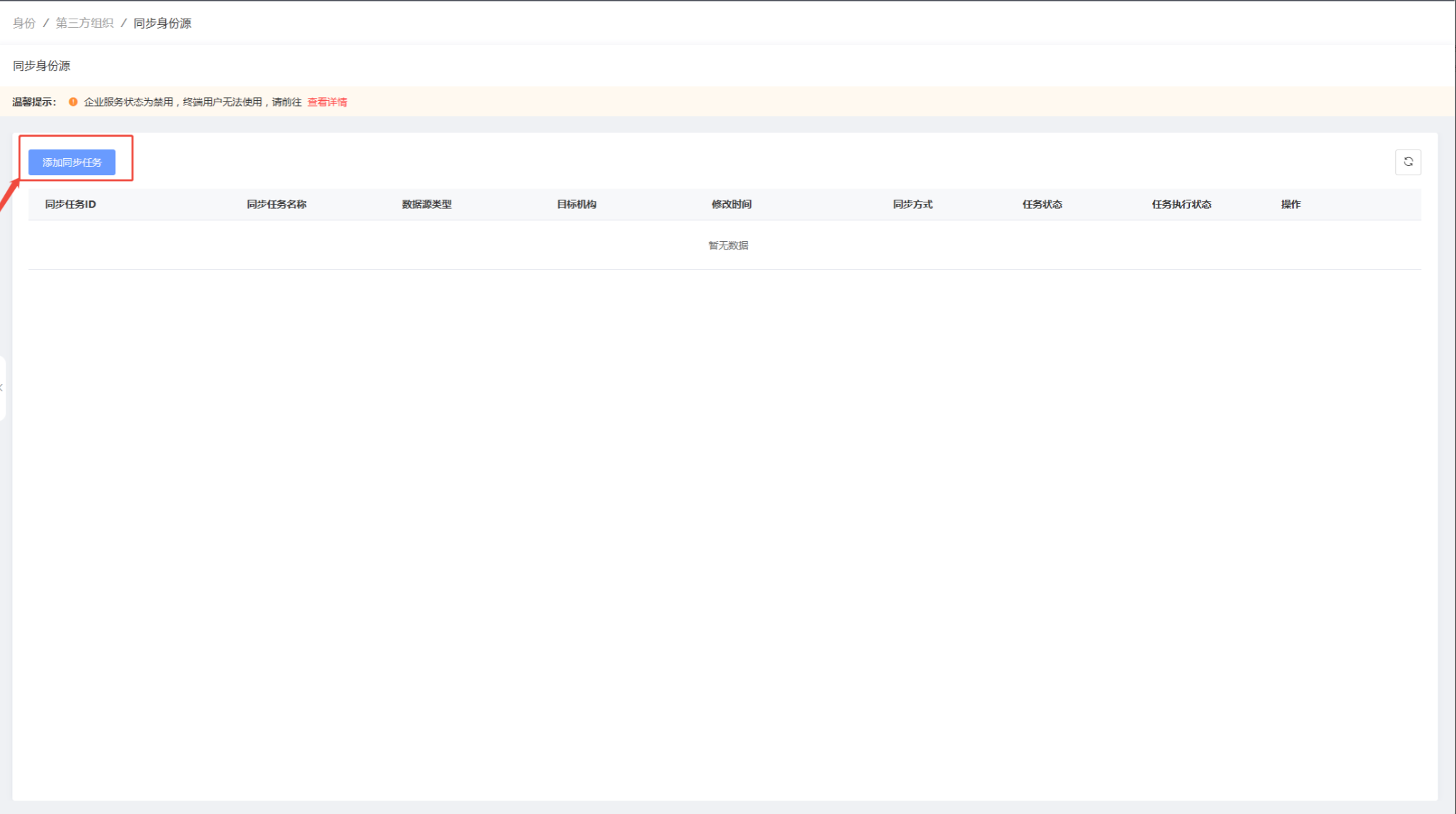 在左侧导航栏身份-第三方组织,选择同步身份源菜单。