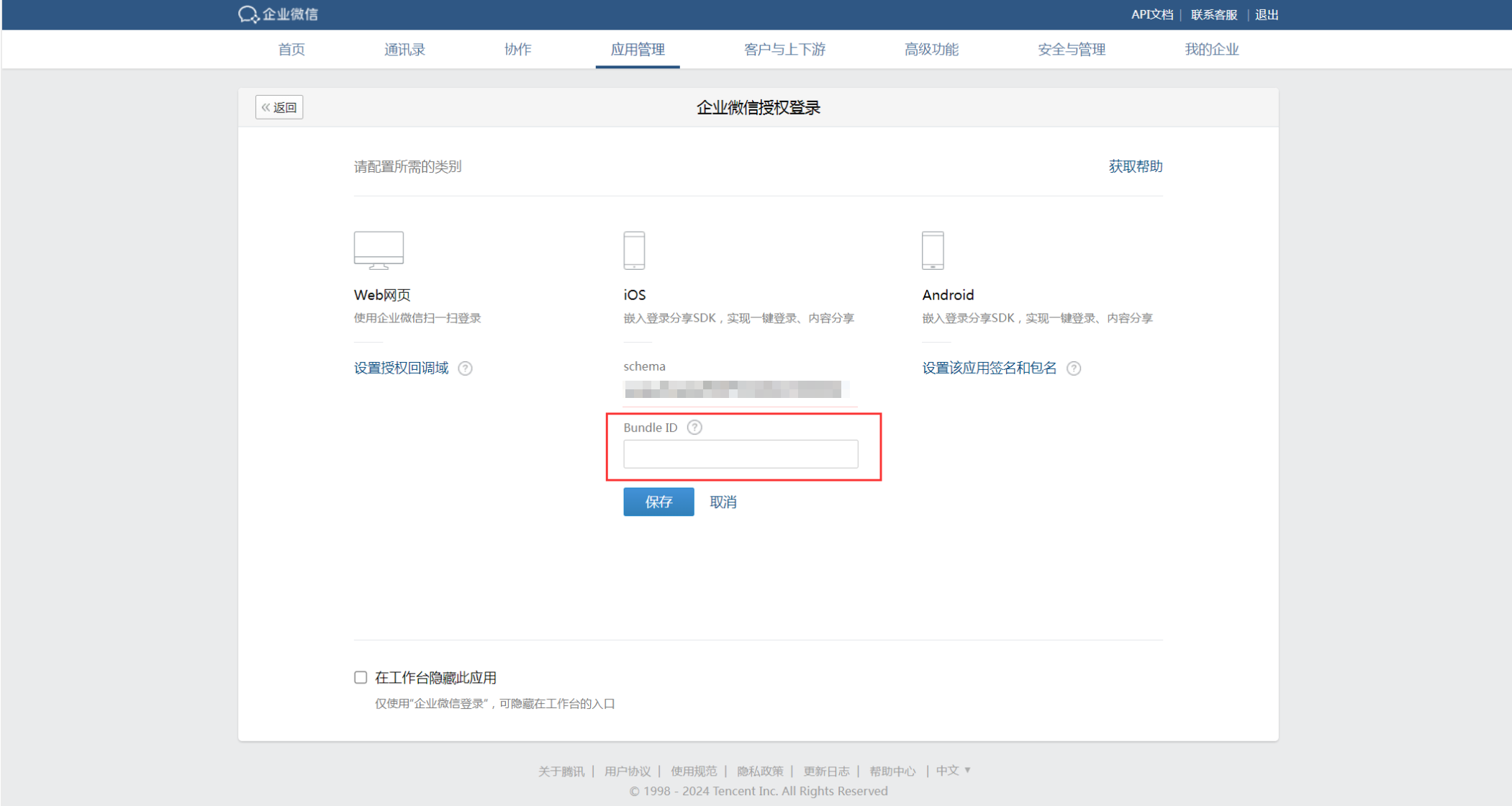 应用创建完成后,在开发者接口中设置“企业微信授权登录”模块,点击“设置”按钮,再点击“设置Bundle ID”按钮,设置Bundle ID信息。