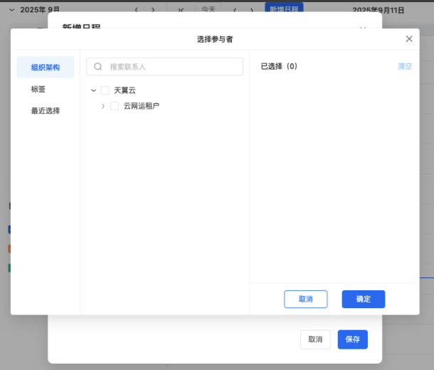 添加参与人,支持从企业组织架构下快速搜索联系人。