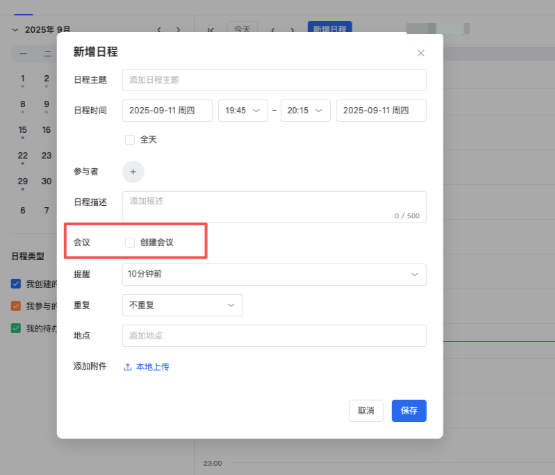 创建会议,如果创建的日程需要使用会议功能,可以勾选创建会议选项,系统将默认创建花卷会议。