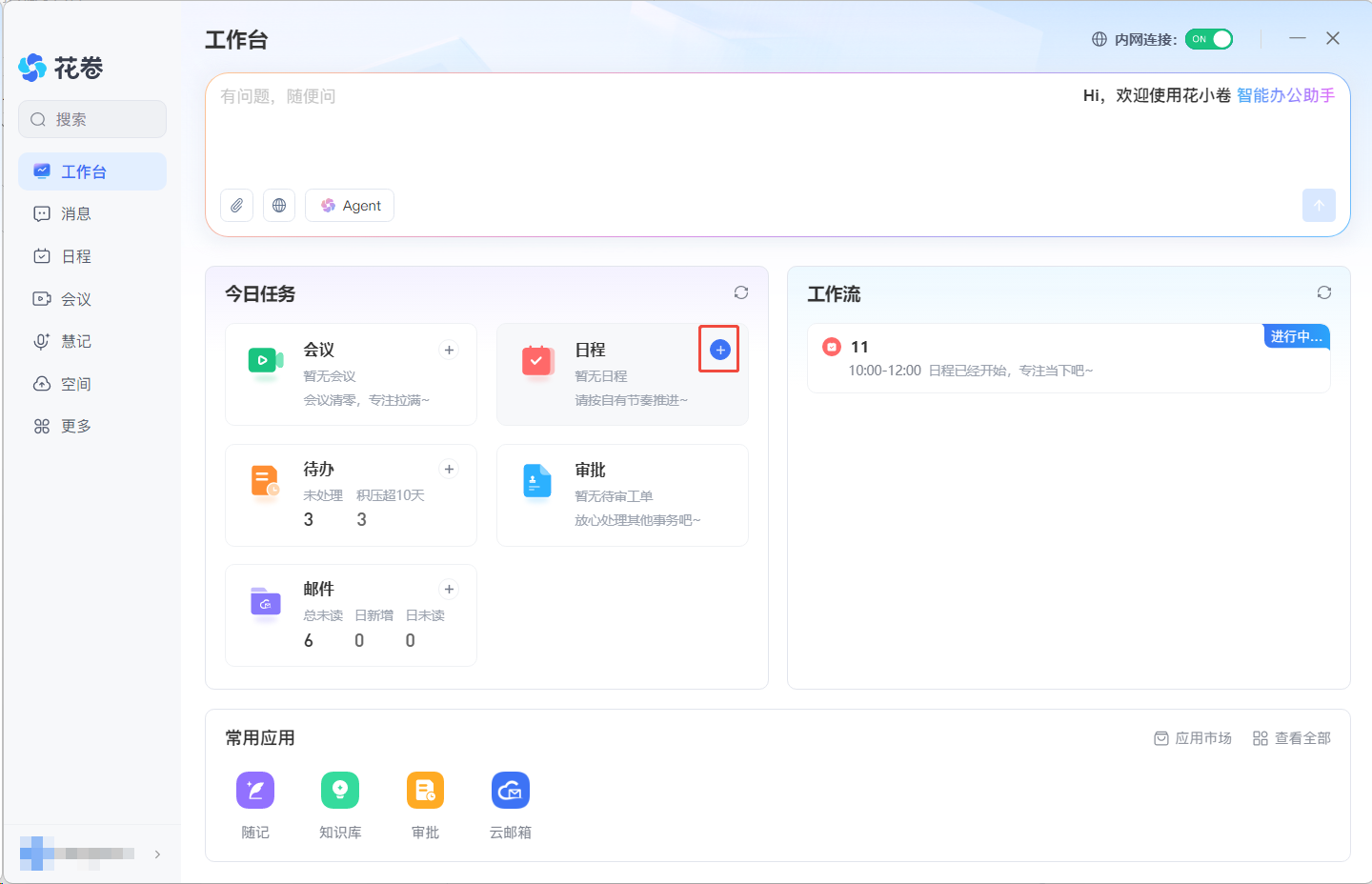 方法 3:点击花卷客户端工作台今日任务日程旁的新增按钮,即可快速进入“新增日程”页面。