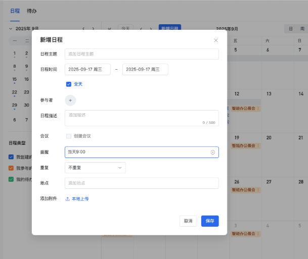 在“新增日程”页面中,你可以填写日程信息,如日程主题、时间、地点等,还可以为日程设置重复规则。