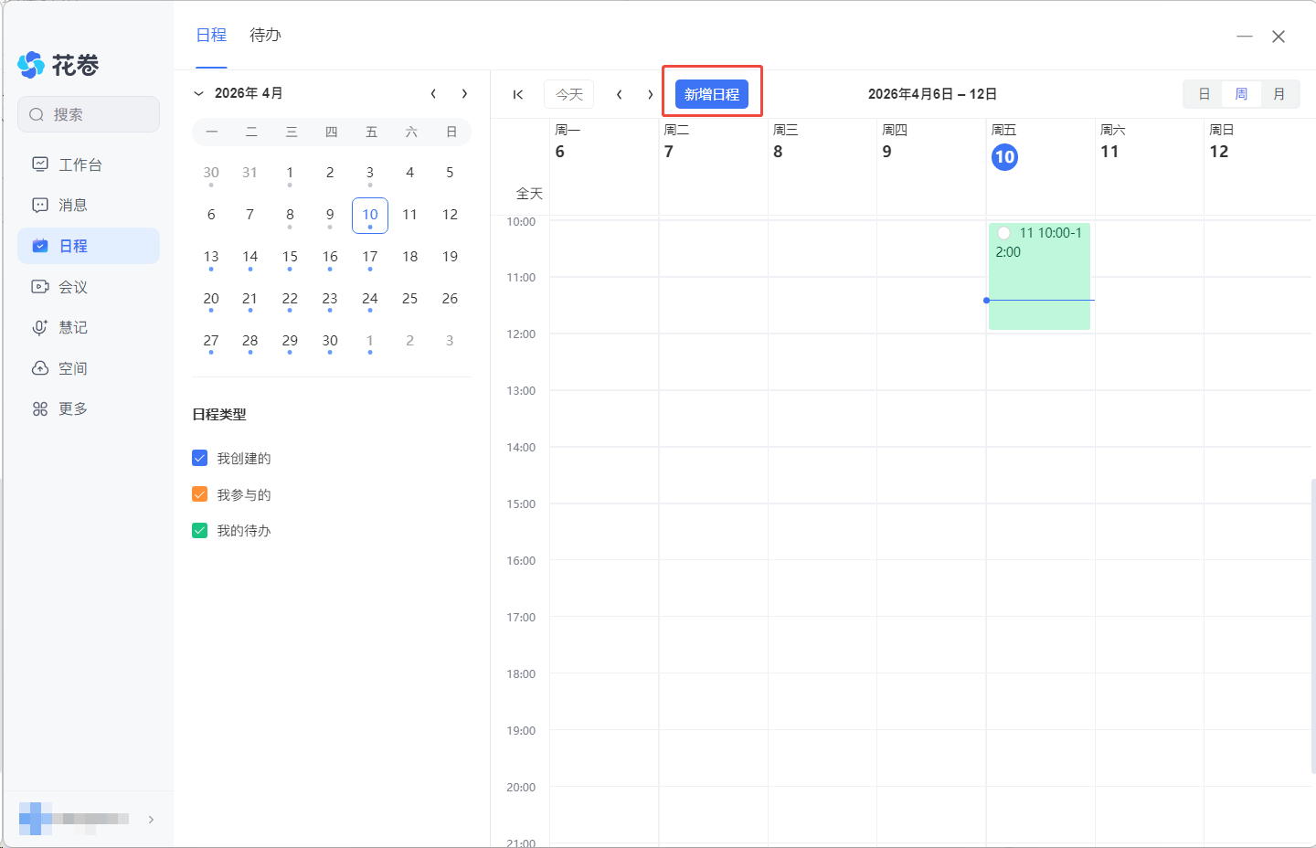 方法 1:点击花卷客户端导航栏的日程,在日历视图中点击右上角“新增日程”,即可进入“新增日程”页面。