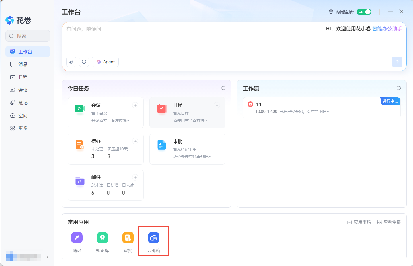 访问花卷慧办,点击工作台-应用,点击“云邮箱”即可打开。