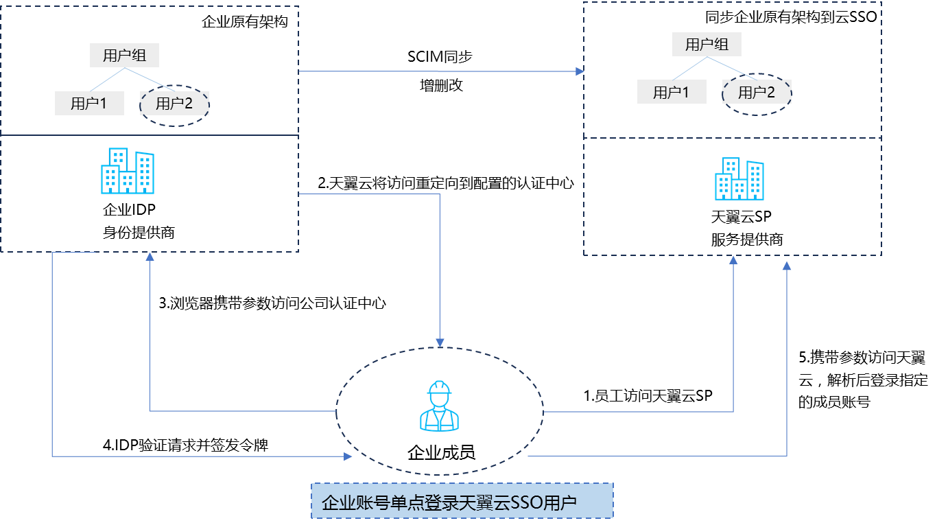 客户已有账号体系可以通过SAML2.0直接单点访问天翼云账号,并可以通过SCIM同步客户侧的用户/组信息;