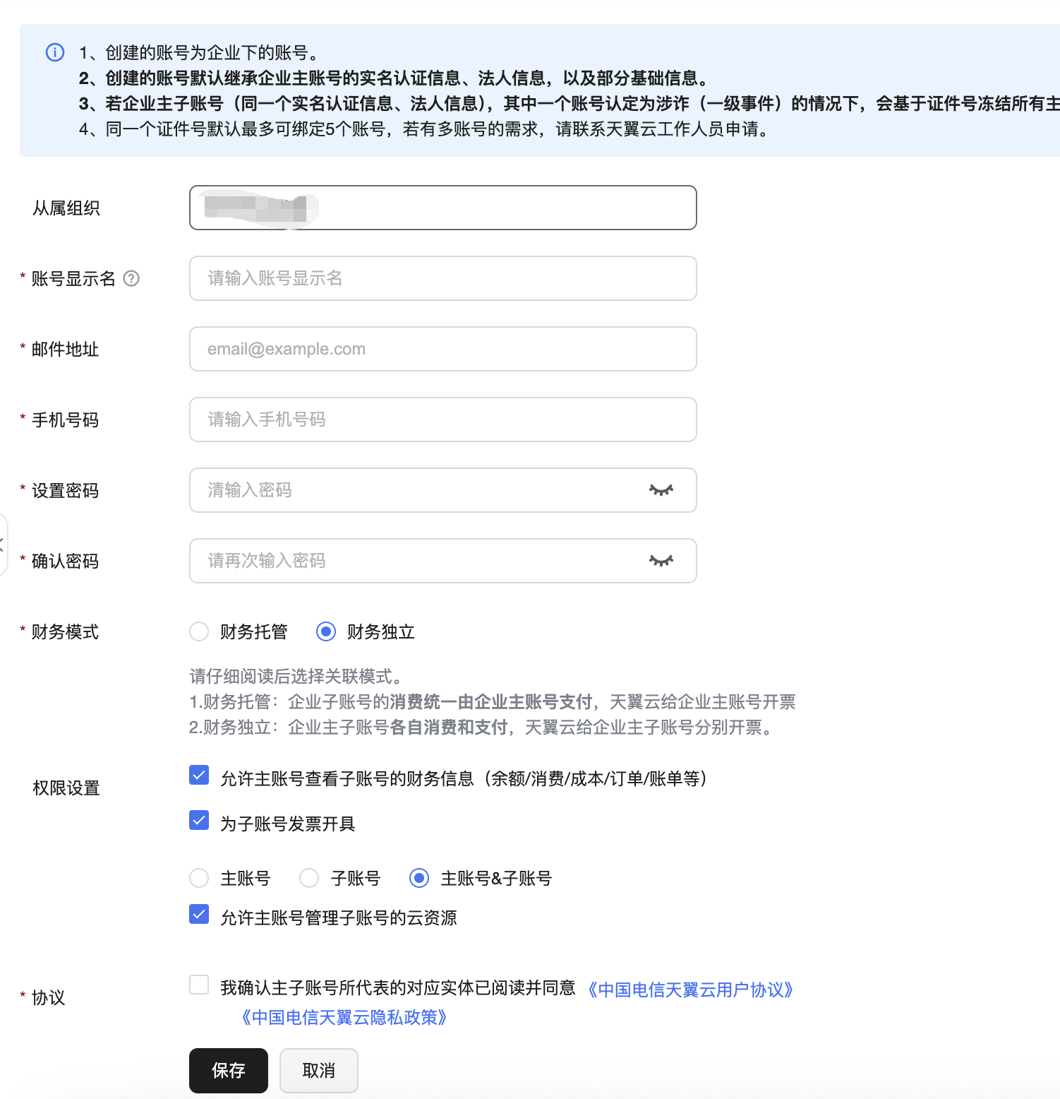 1)天翼云云公司、云省分线上渠道客户,创建完成后,子账号可基于账密信息进行登录使用。产生的订单由主账号的账户进行计费。
