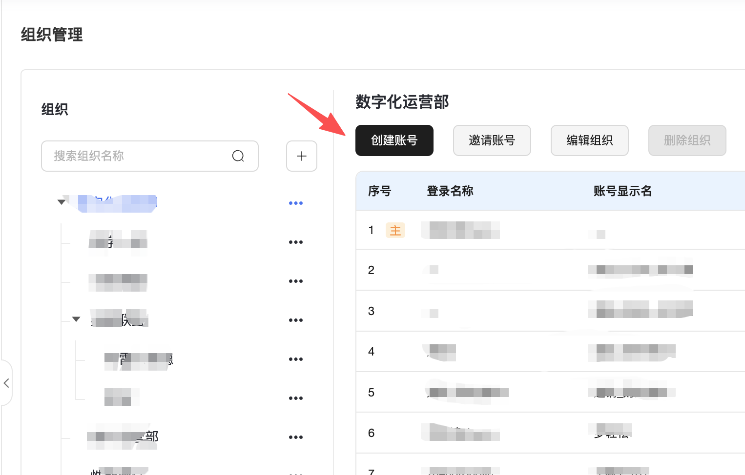 2. 选中需要创建子账号的组织,点击“创建账号”。