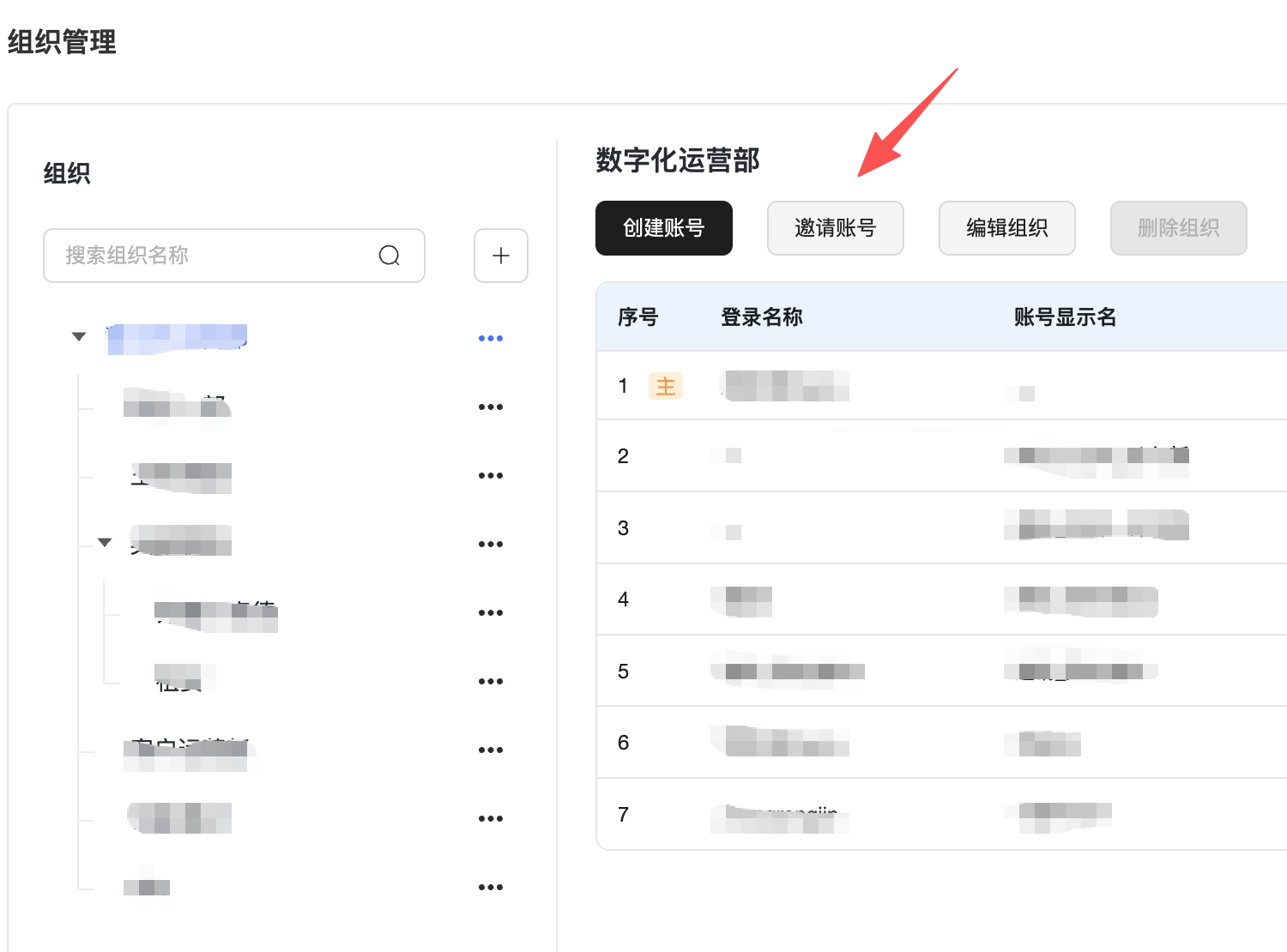 2. 选中需要邀请子账号的组织,点击“邀请账号”。