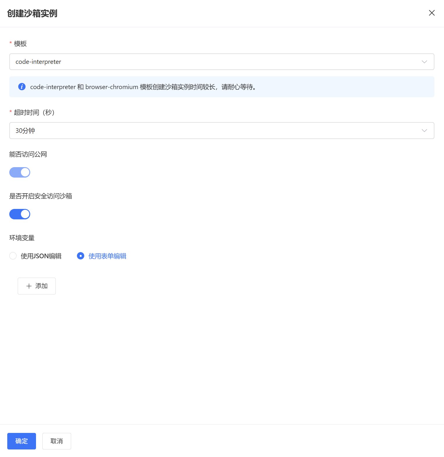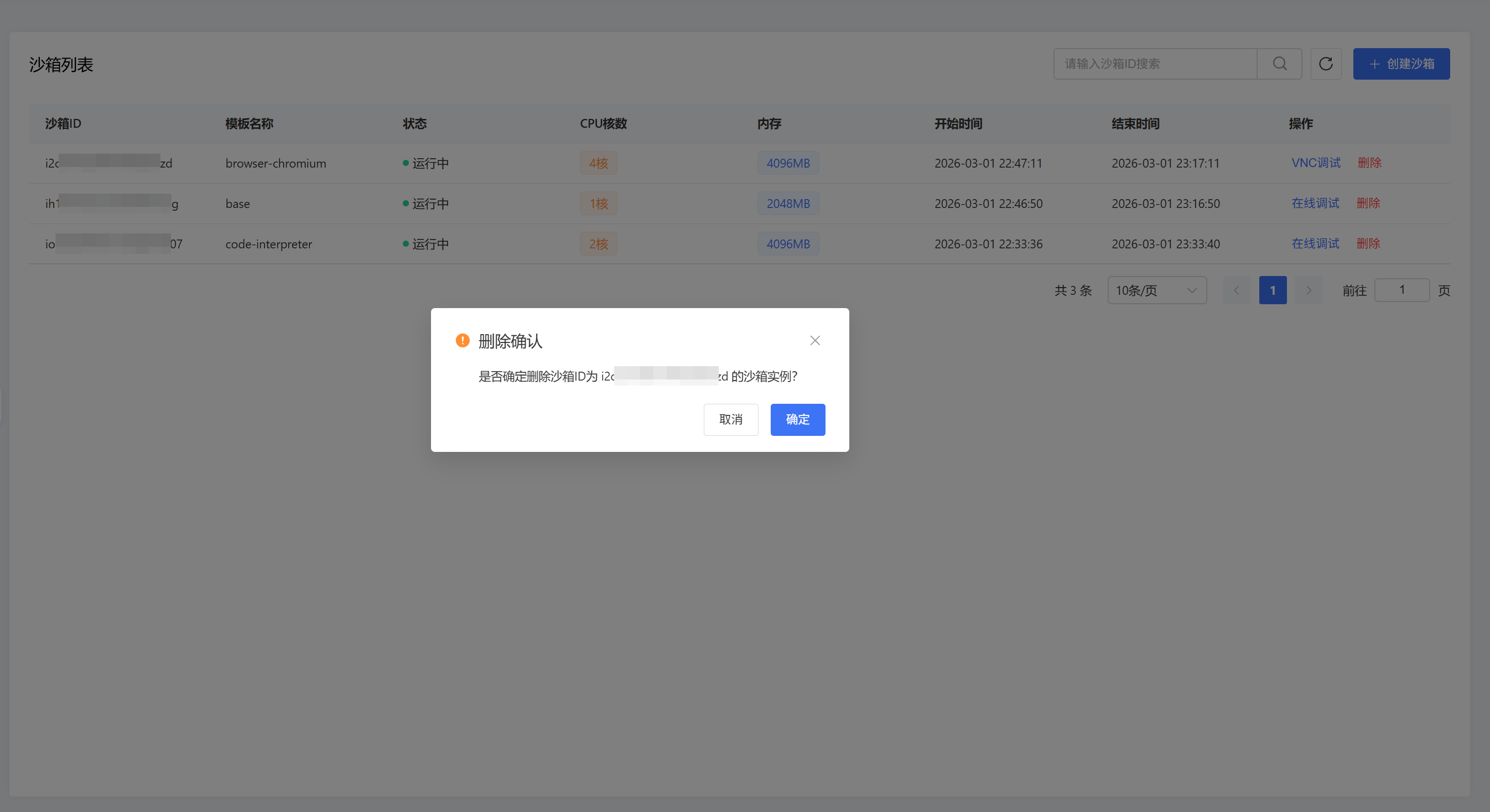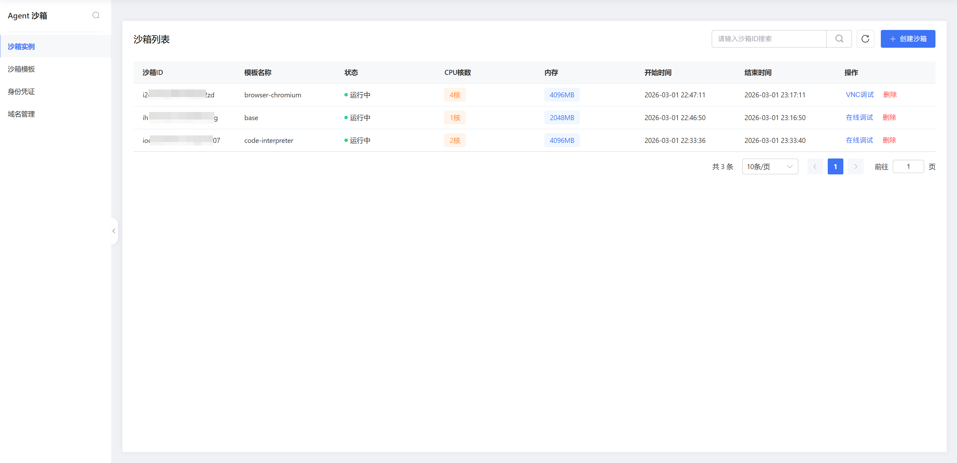 | 模板 | Agent沙箱支持base、code-interpreter和browser-chromium三种类型沙箱模板 |