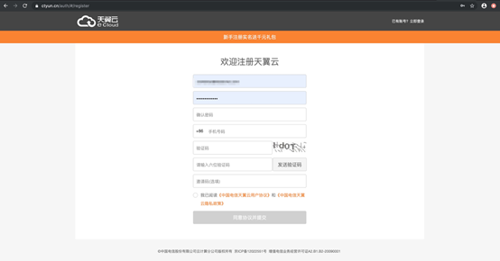 在天翼云官网没有账号的用户,请先注册一个账号,注册地址为https://www.ctyun.cn/auth/#/register