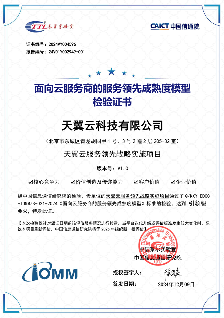 近日,天翼云科技有限公司顺利通过中国信通院研制的《面向云服务商的服务领先成熟度模型》评估,并荣获最高级别——“引领级”。这一成绩不仅彰显了天翼云在服务质量、技术创新和客户价值塑造方面的行业领先地位,也为整个云服务市场树立了新的标杆。