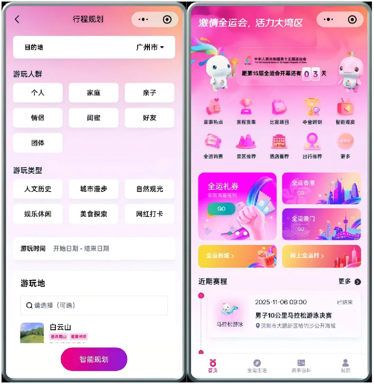 赛场内外,服务持续在线。面向公众的“全运通”平台,在天翼云的算力加持下,为观众提供从AI导览、赛事追星到“吃住行游购娱”的全链路智慧体验,让观赛更智能、生活更便捷。