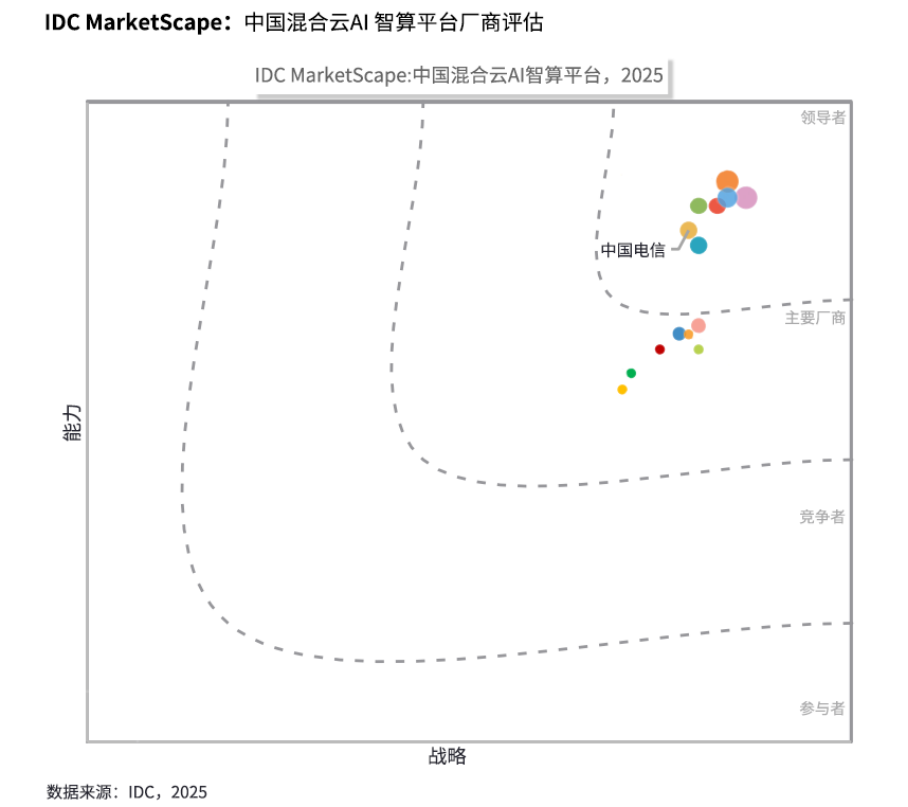 近日,国际数据公司IDC发布《IDC MarketScape: 中国混合云AI智算平台2025年厂商评估》报告,从战略和能力维度对云服务商进行了综合评估。报告显示,中国电信天翼云位列领导者象限,能力维度位居运营商云第一,充分彰显了天翼云作为云服务国家队在混合云AI智算领域的核心地位。