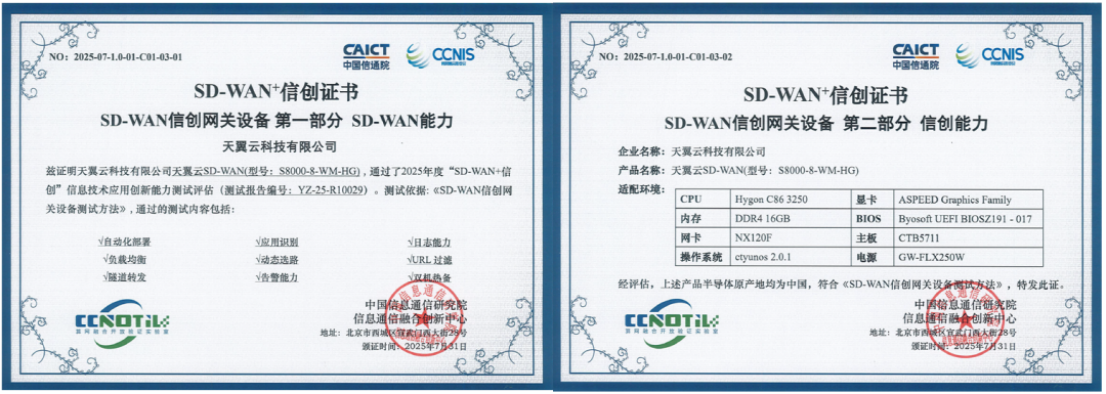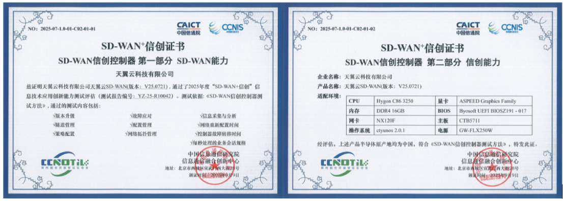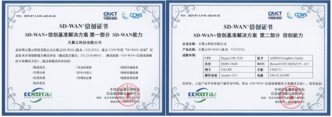 首批通过!天翼云斩获中国信通院多项“SD-WAN⁺信创”认证