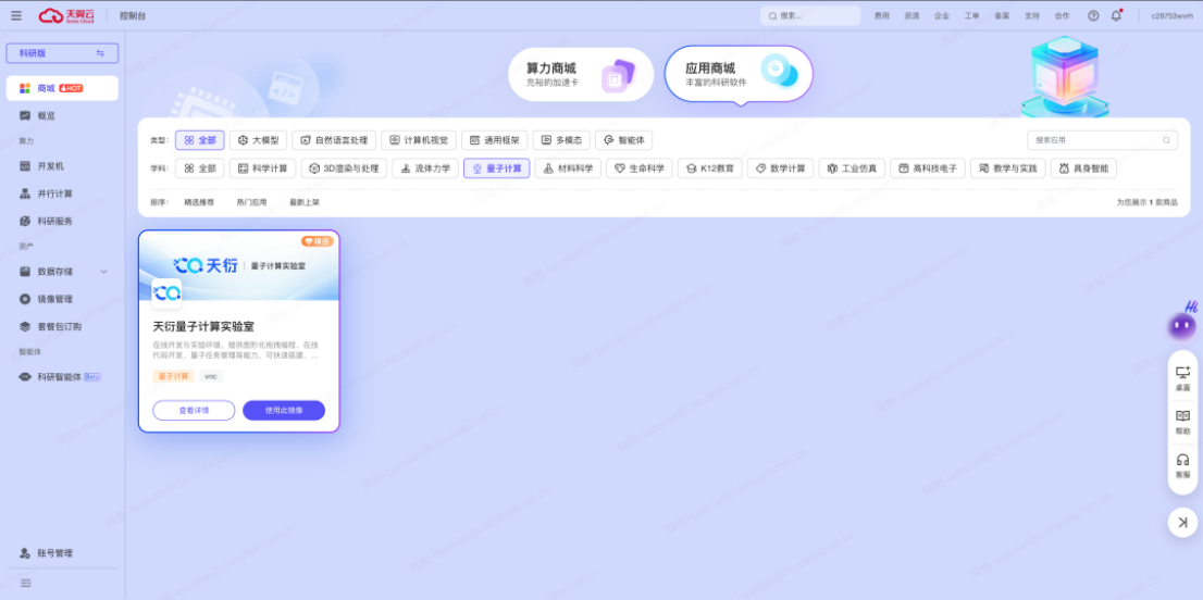 作为天翼云打造的一站式高性能科研服务平台,息壤科研助手聚焦科研全流程需求,围绕“业务调研、思路生成、实验设计、算力调度、结果分析、知识沉淀”等环节,提供更完整的云端支撑能力。平台已预置90多个科研应用,覆盖20多个学科领域,服务科研任务、教学实训、生物信息、工业仿真、具身智能、自动驾驶等场景。天衍量子实验室的上架,不仅彰显了息壤科研助手对前沿科研工具的承载与整合能力,也进一步拓宽了平台的科研服务范围。
