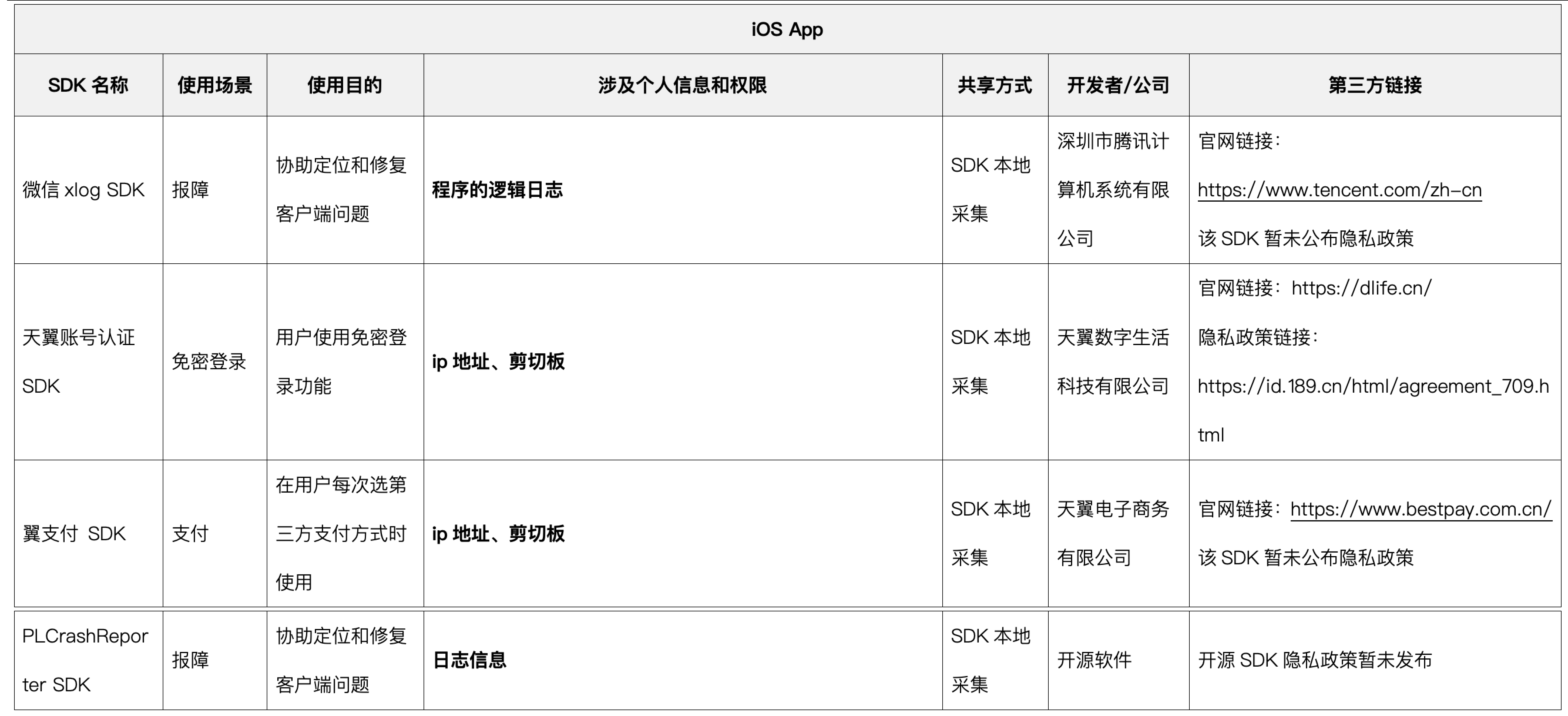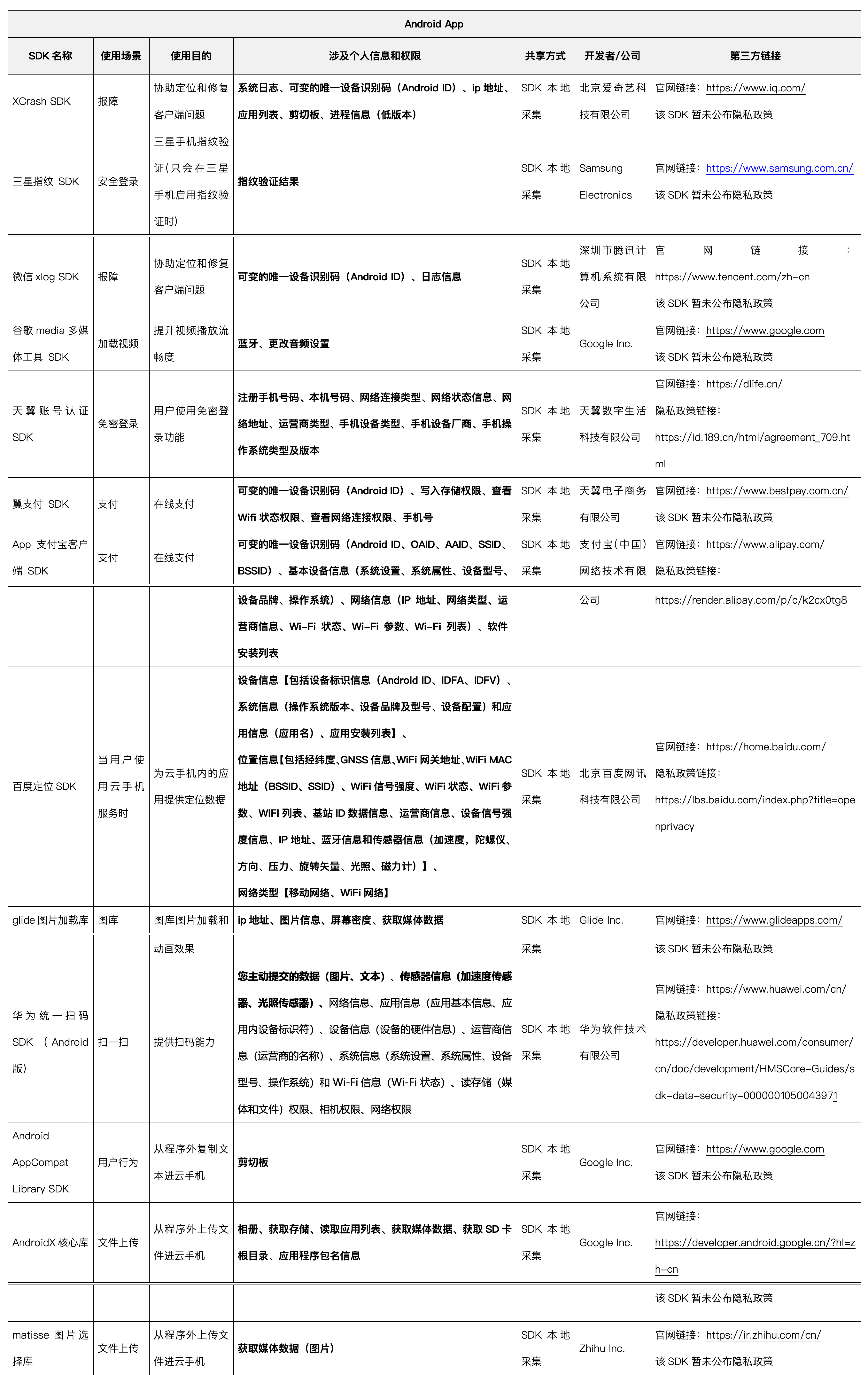 为保障天翼云手机App相关功能的实现与应用的稳定运行,我们可能会接入由第三方提供的软件开发包(SDK)以实现相关目的。我们会对合作方获取信息的软件工具开发包(SDK)进行严格的安全监测,以保障数据安全。您可以通过以下链接查看第三方的数据使用和保护规则。