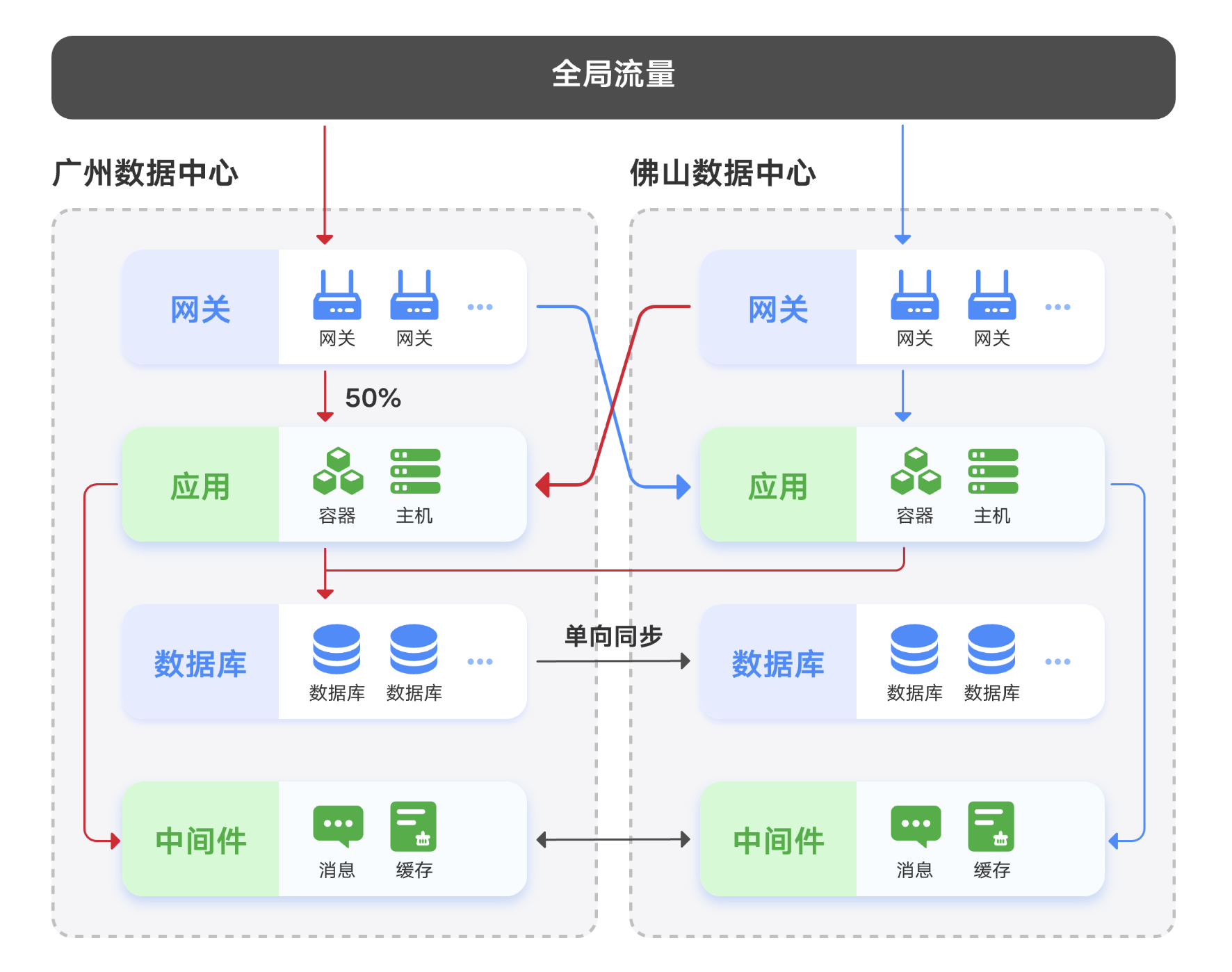 用户的业务应用部署在云上两个地域或可用区作为两个数据中心,两个中心同时对外提供服务,业务流量跨中心双活,数据区分主备集群,灾难发生时需要快速切换流量和数据,要有统一的容灾管控,能够保障切换效率和数据一致性。
