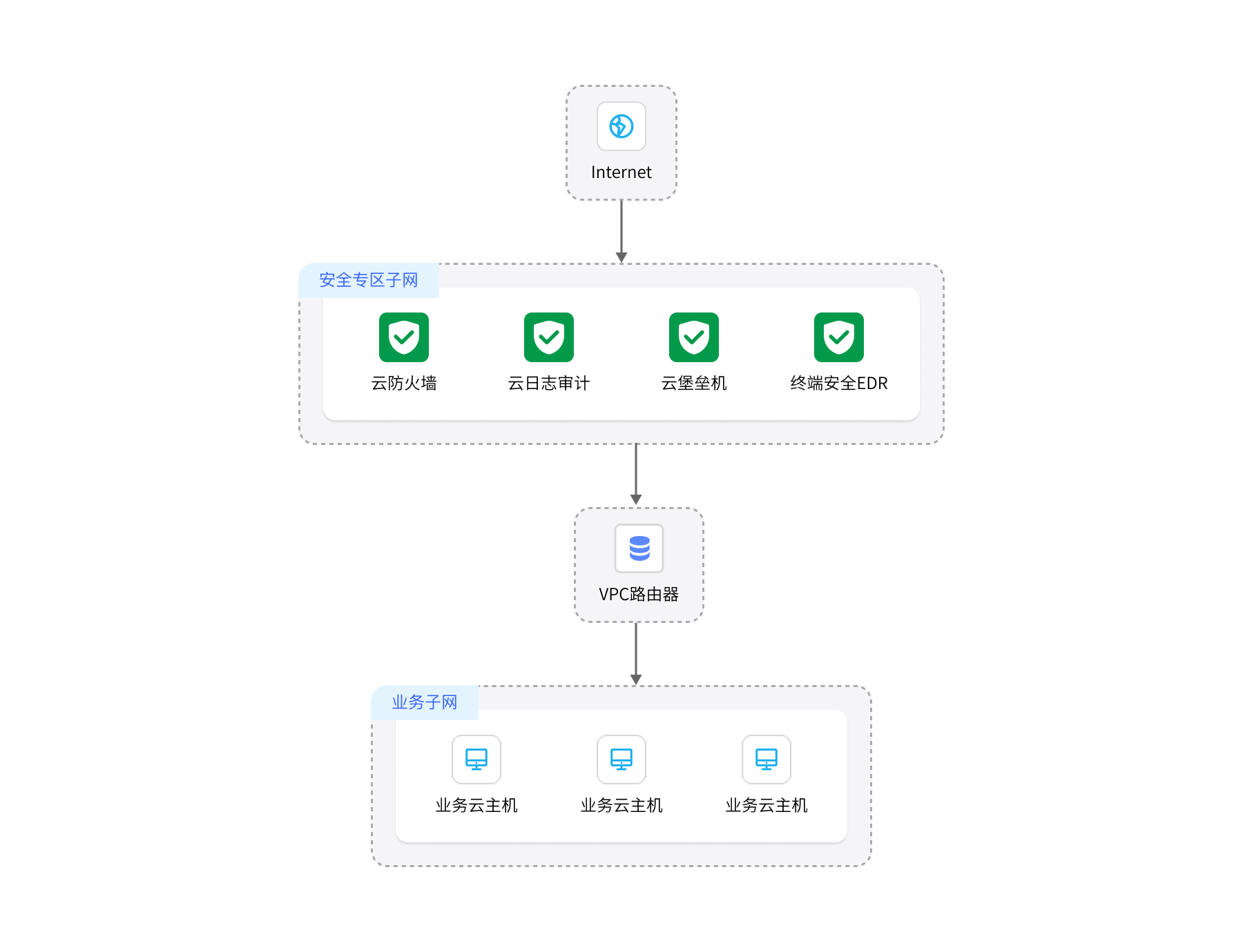 用户在天翼云中一个专有网络VPC(Virtual Private Cloud)内部署了业务系统,需要进行安全防护的场景