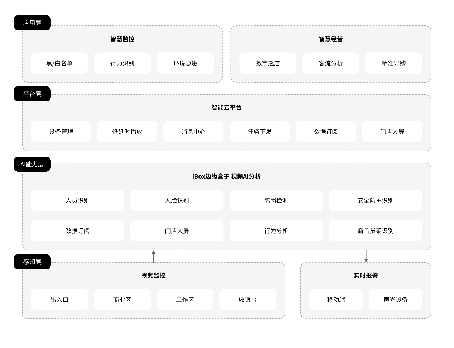 面向商超便利、餐饮、鞋服箱包、医药保健等行业,实现对人、货、场的全面采察,赋能零售智能化资产保护、标准化运营管理、数字化营销服务建设,推进零售数智化转型